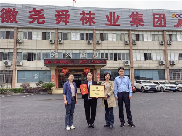 5月6日,市总工会副主席黄河一行赴安徽尧舜智能袜业有限公司,向织造车间送上“全国五一巾帼标兵岗”荣誉牌匾。东至县政协副主席、县总工会主席吴筱媛,县总工会党组书记、副主席刘逢春陪同授牌。