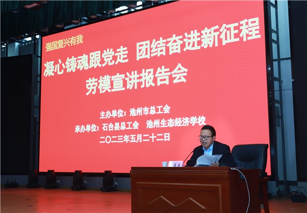 5月22日下午,池州劳模工匠宣讲团走进池州市生态经济学校开展宣讲活动,旨在引领广大师生在劳模精神、劳动精神和工匠精神的感召下,争当劳动先锋、争做强国先锋、争做时代新人。