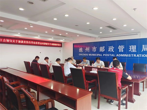 6月7日,省总工会党组成员、经审会主任曾传发一行赴池州邮政快递业开展快递员等新就业形态劳动者权益维护工作专题调研,市总工会党组书记、副主席刘荣发,池州局、市快递行业工会联合会相关负责同志,快递员工代表陪同调研。