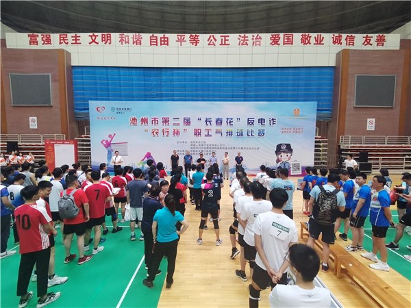 为进一步推动池州市反诈工作深入开展,增强池州市各行业打击治理电信网络诈骗工作的凝聚力和向心力,6月17日至18日池州市总工会、池州市打击治理电信网络新型违法犯罪工作联席会议办公室、中国人民银行池州中心支行、池州市老年人体育协会以及农业银行池州分行在池州市体育馆联合举办第二届“长春花”反电诈“农行杯”职工气排球比赛。16支代表队200多名运动员参赛。