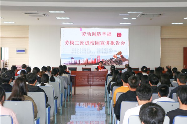 5月9日上午,劳模工匠宣讲活动走进安徽交通中等职业技术学校, 150余名学生现场聆听了劳模工匠的先进事迹。池州市总工会党组成员、副主席沈军,池州市教育系统工会主席胡长平,安徽交通中等职业技术学校党委书记朱和记出席活动。