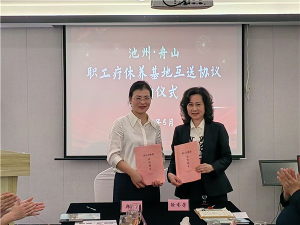 会上,两地市总工会负责人分别介绍了本地的人文、生态、疗休养和文旅资源,并就围绕职工疗休养互送工作进行座谈,会上还播放了池州市和舟山市职工疗休养宣传片,两地职工疗休养基地九华山旅游和恒尊文旅负责人分别作线路推介,两家基地还签订了职工疗休养互送协议。池州和舟山部分县区工会负责人参加座谈。